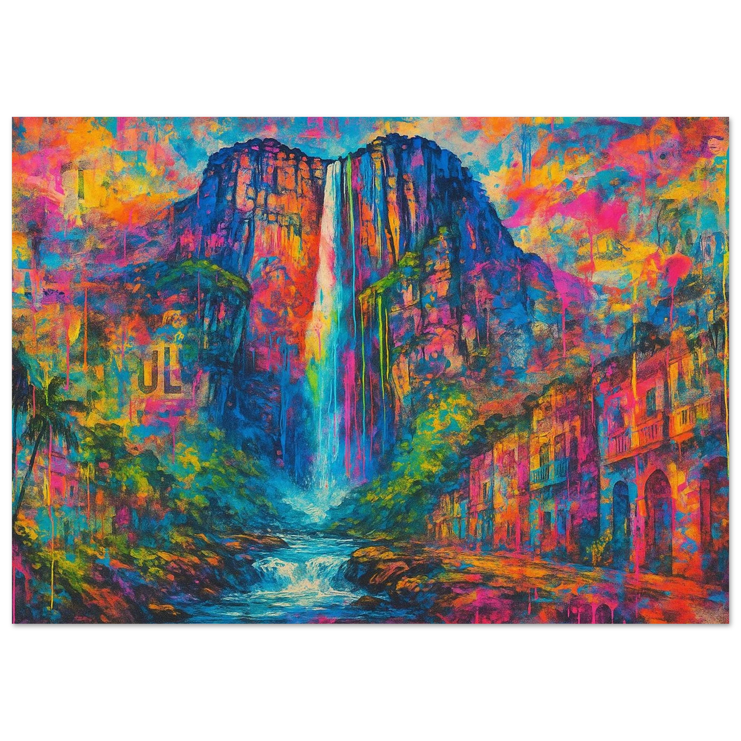 Exploding with color and movement, Angel Falls Majesty reimagines Venezuela’s iconic natural wonder in a breathtaking fusion of surrealism and street-art vibrancy. A rainbow cascade pours down from the towering cliffs, framed by lush greenery and colonial facades that glow under neon-like hues of pink, orange, and turquoise. The scene is alive with energy, blending the majesty of nature with the vibrancy of culture.
