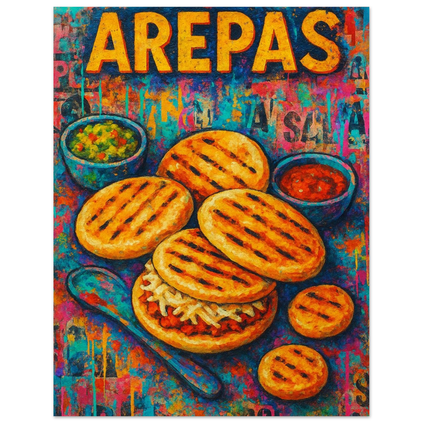 Warm, comforting, and full of heritage, Arepas Tradition celebrates one of Venezuela’s most iconic foods. This vibrant artwork showcases golden arepas fresh off the grill, paired with colorful sauces and rich textures that make the dish come alive. The graffiti-style background adds an urban flair, blending tradition with modern artistry.