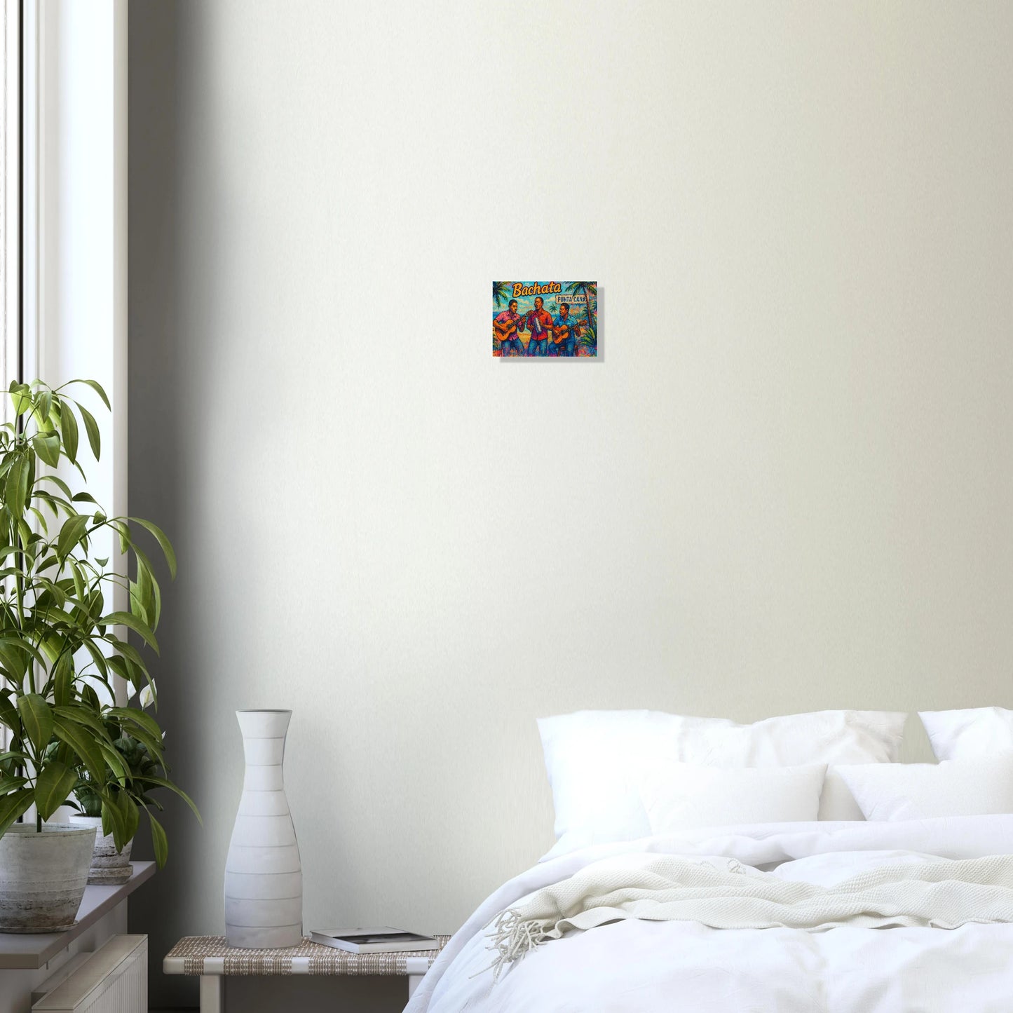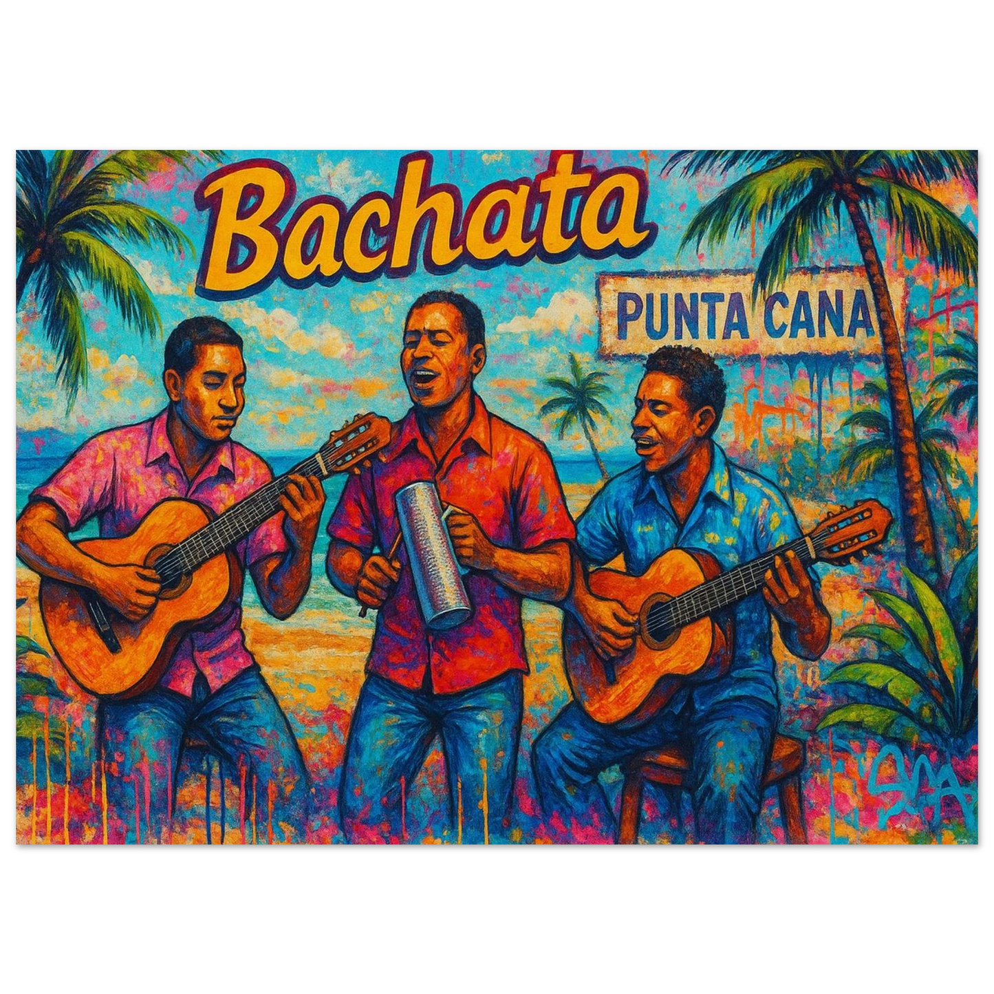 Joyful and rhythmic, Bachata en Punta Cana celebrates the heart and soul of the Dominican Republic’s most beloved musical genre. Three musicians play under swaying palm trees on a tropical beach, their guitars and güira filling the air with vibrant energy. Painted in bright, expressive strokes of turquoise, coral, and golden tones, the piece radiates warmth, culture, and the passion of island life.