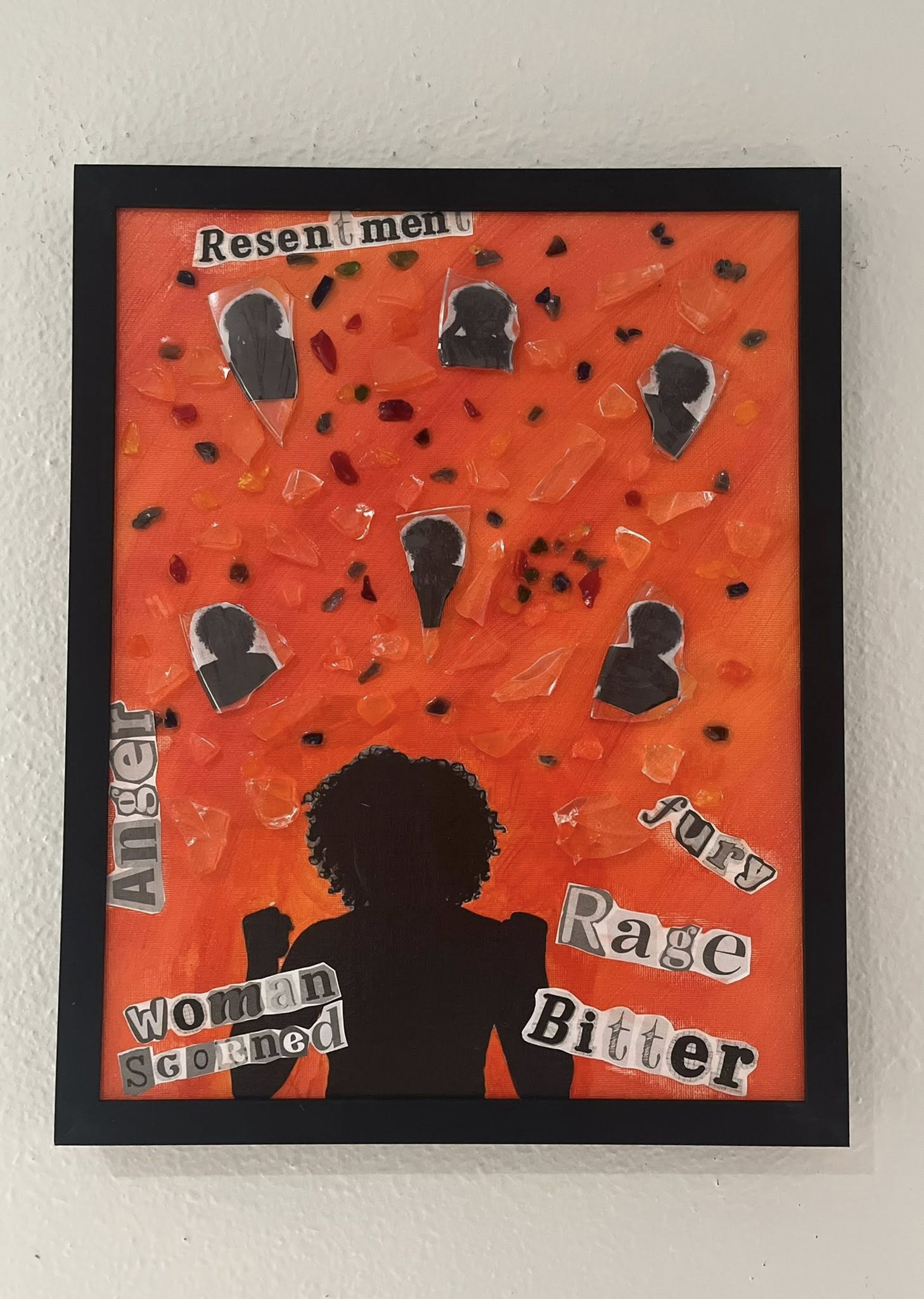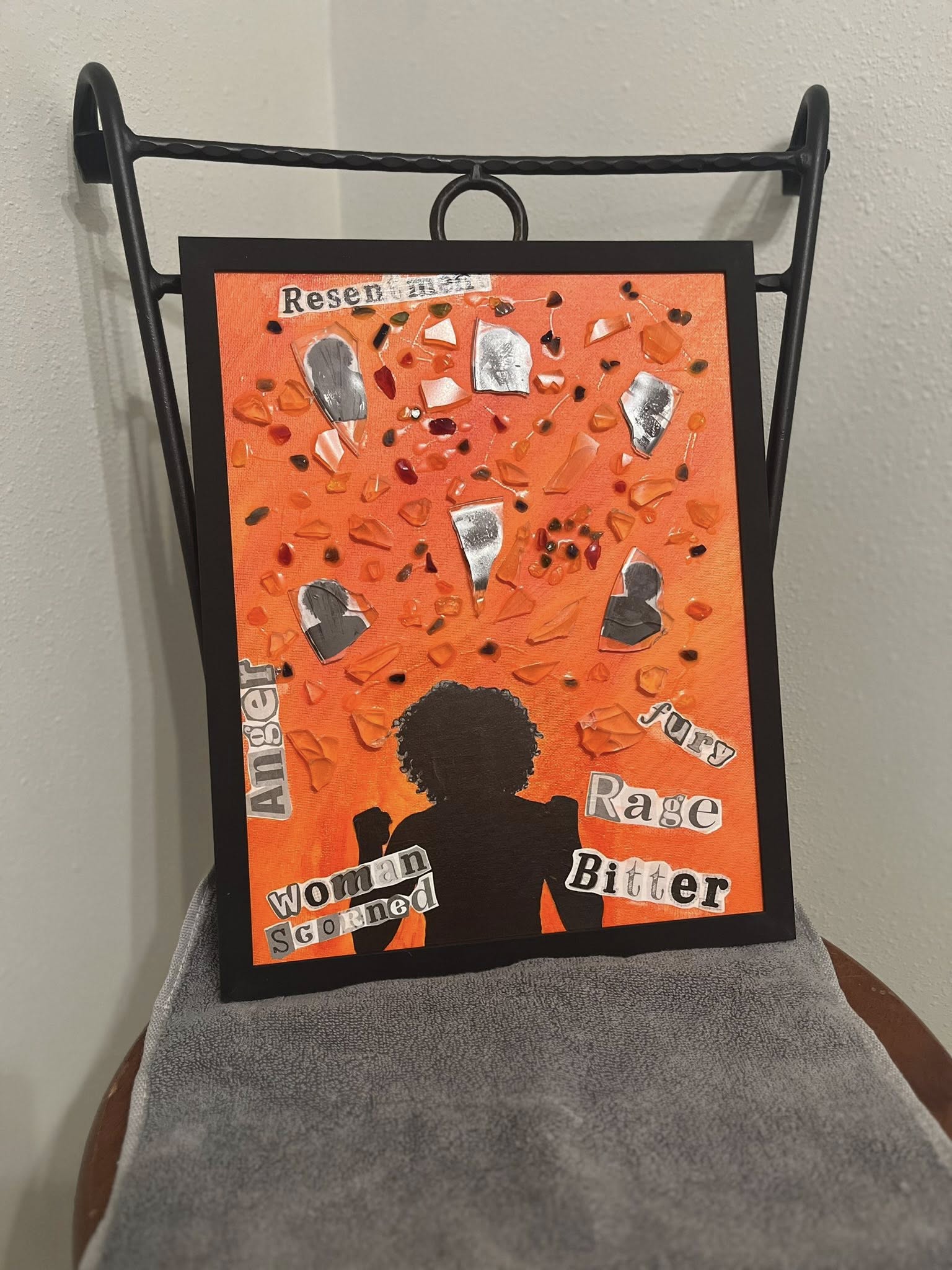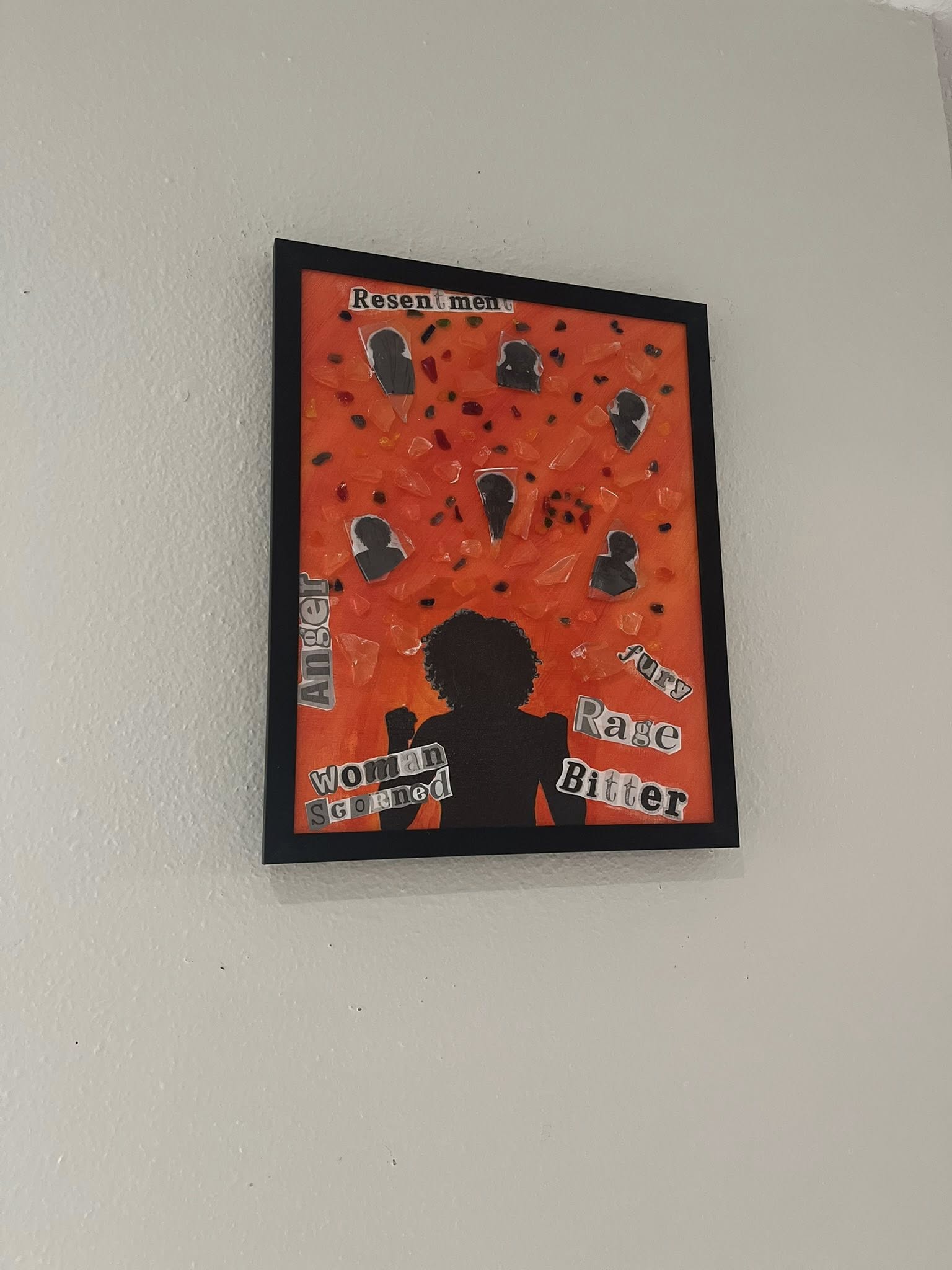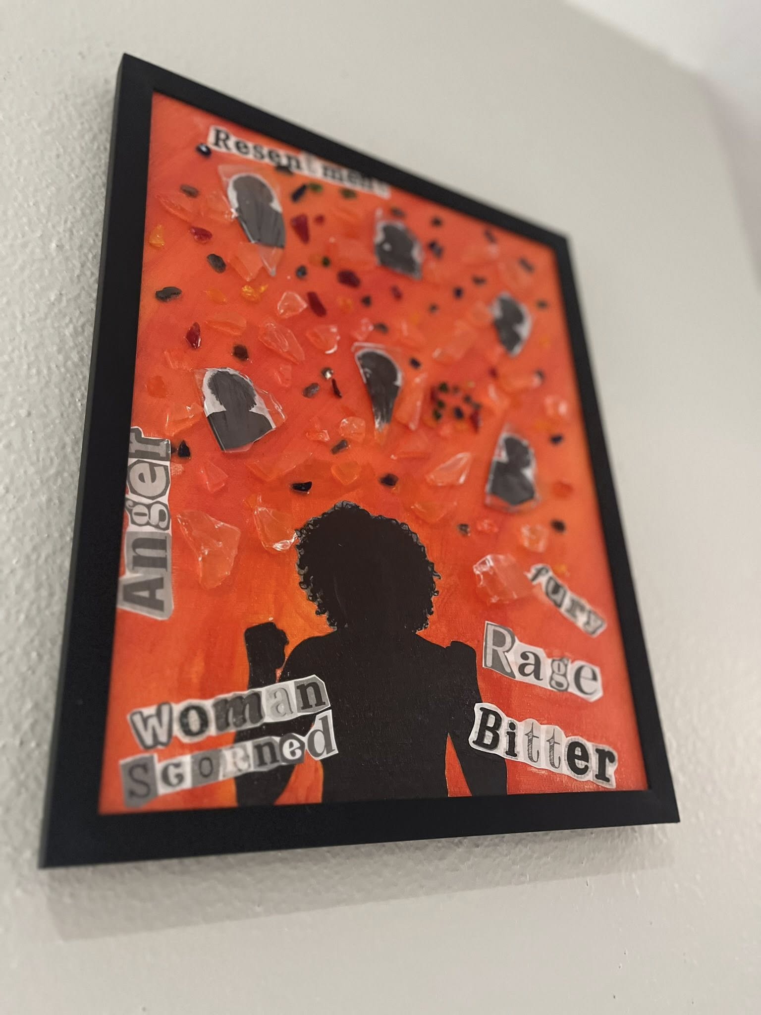 This powerful mixed media art piece captures the intense emotions of feminine rage through a silhouette of a woman surrounded by broken glass. Measuring 11x14" flat canvas and set in a simple black frame, it symbolizes the overwhelming demands placed on women by society and their growing resolve to push back. A bold statement of strength and resilience, this artwork honors the courage women find in standing up for themselves.