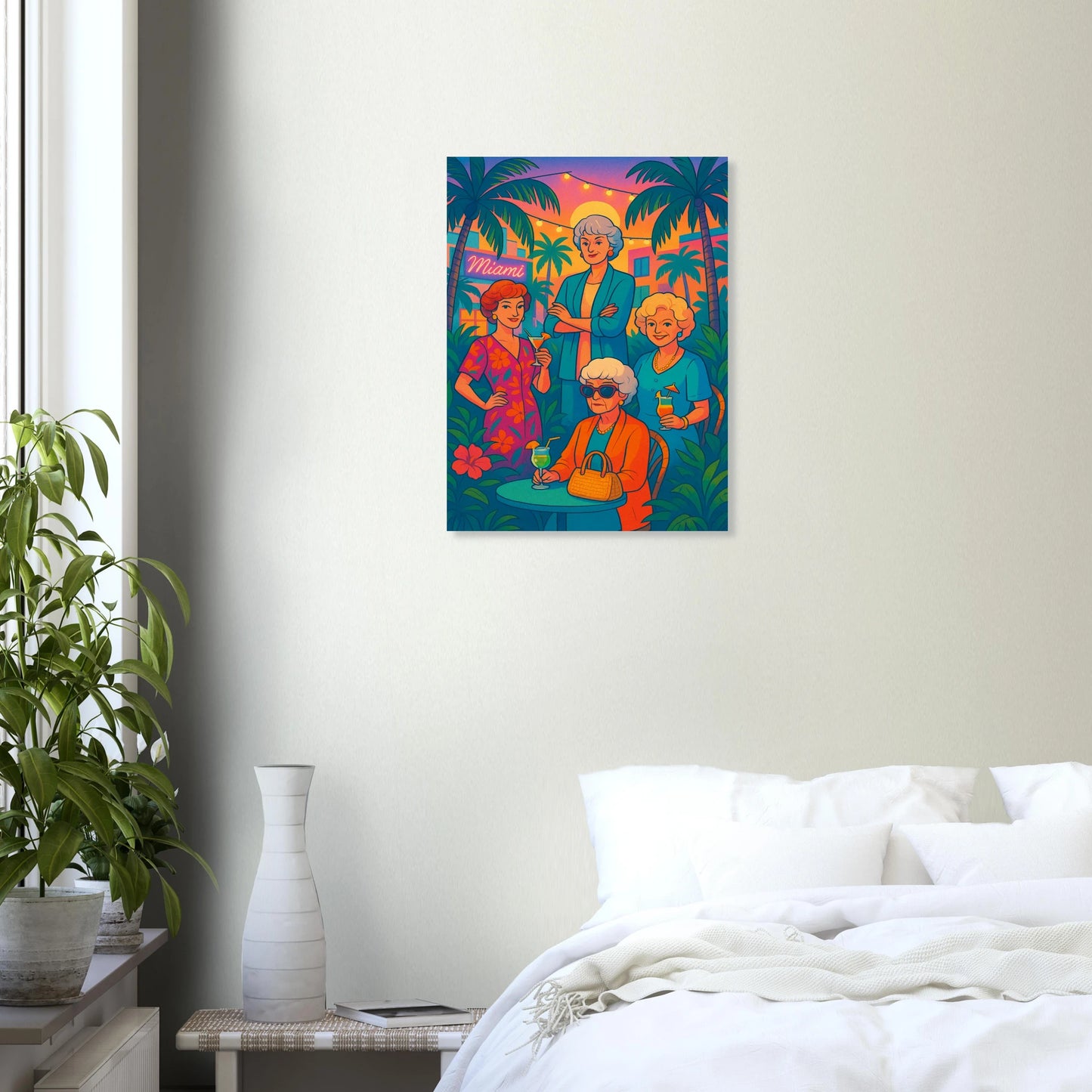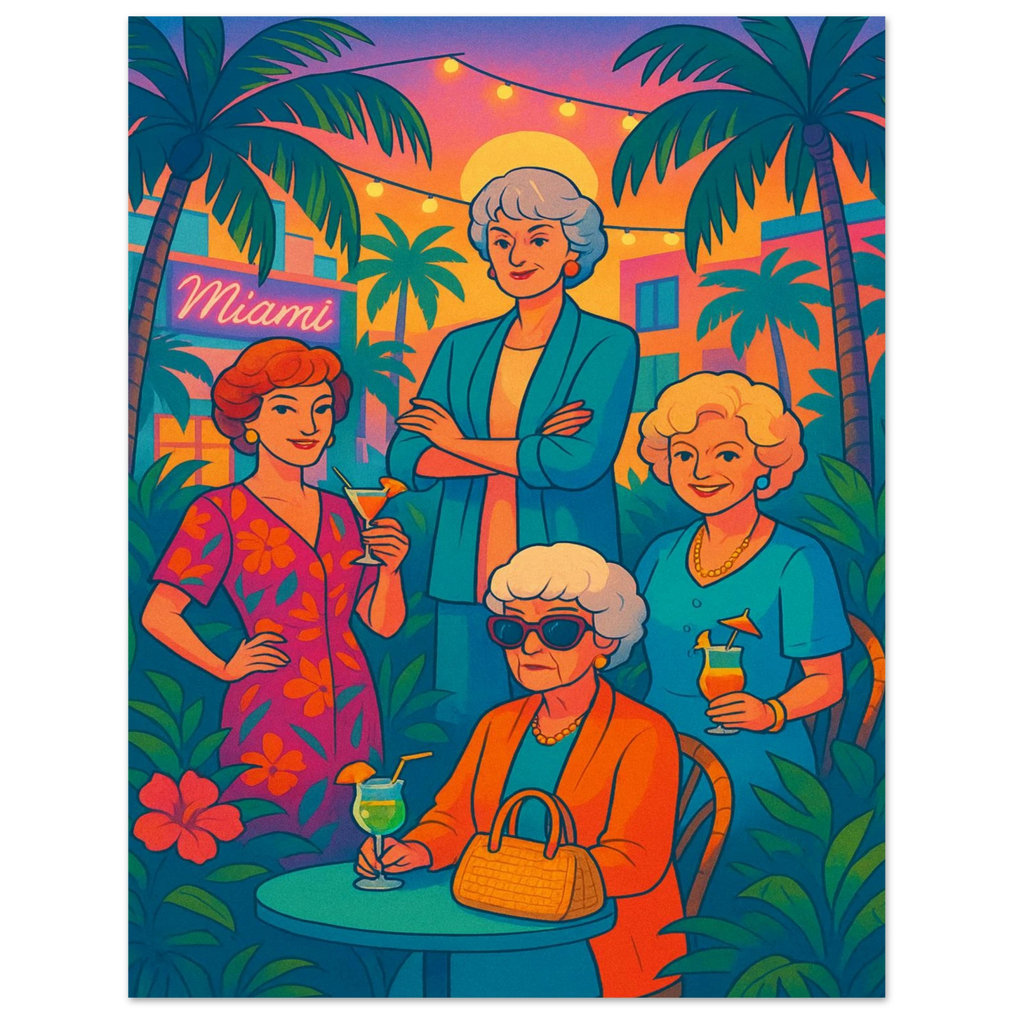 Golden 4 is a vibrant tribute to the beloved Golden Girls, reimagined in a retro Miami sunset palette that bursts with nostalgia, humor, and warmth. With palm trees swaying, neon lights glowing, and cocktails in hand, the iconic quartet radiates sass, style, and sisterhood.