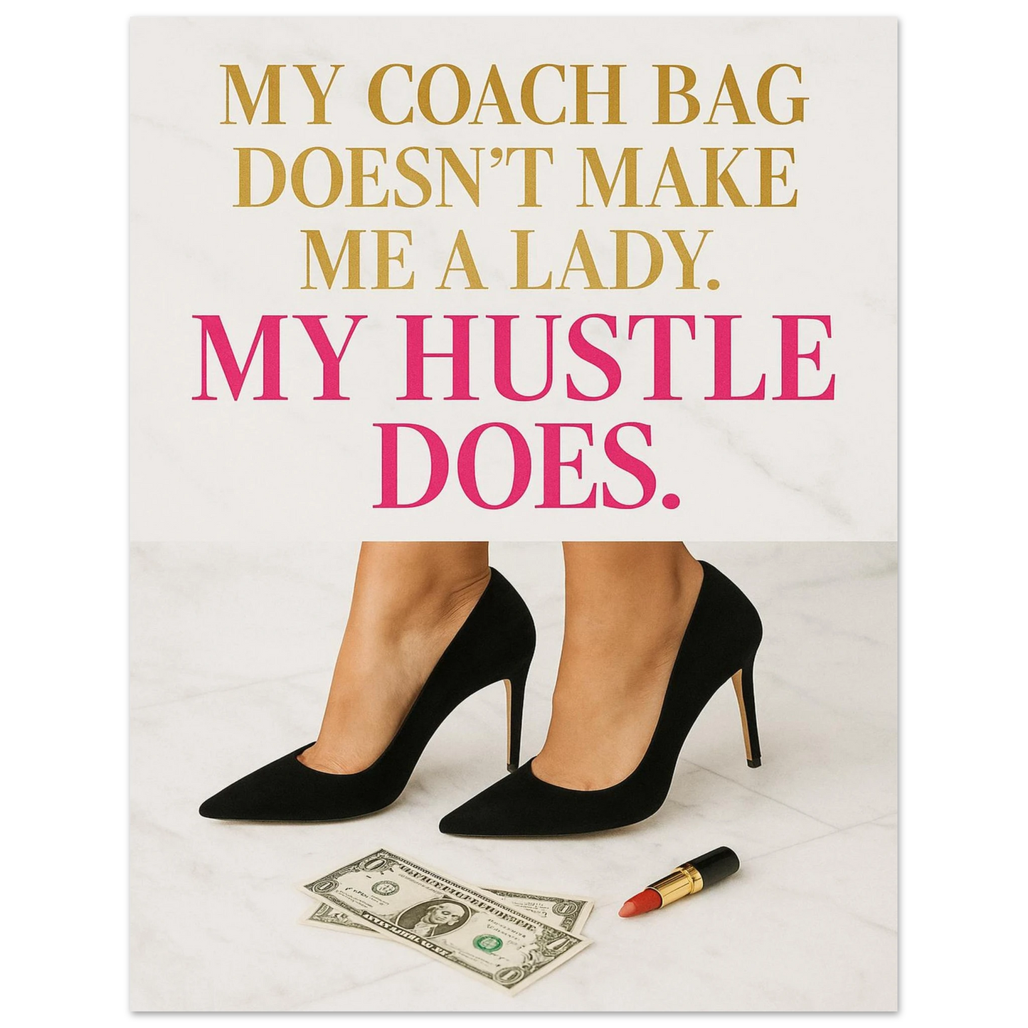 Hustle in Heels is a bold empowerment print that blends fashion and grit. Featuring sleek black stilettos, lipstick, and cash under the statement “My Coach bag doesn’t make me a lady. My hustle does,” this piece celebrates ambition, independence, and unapologetic drive. Perfect décor for entrepreneurs, hustlers, and go-getters who own their power.