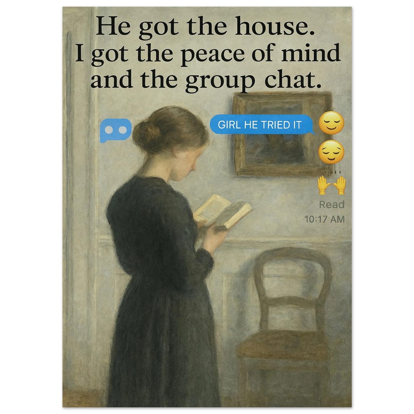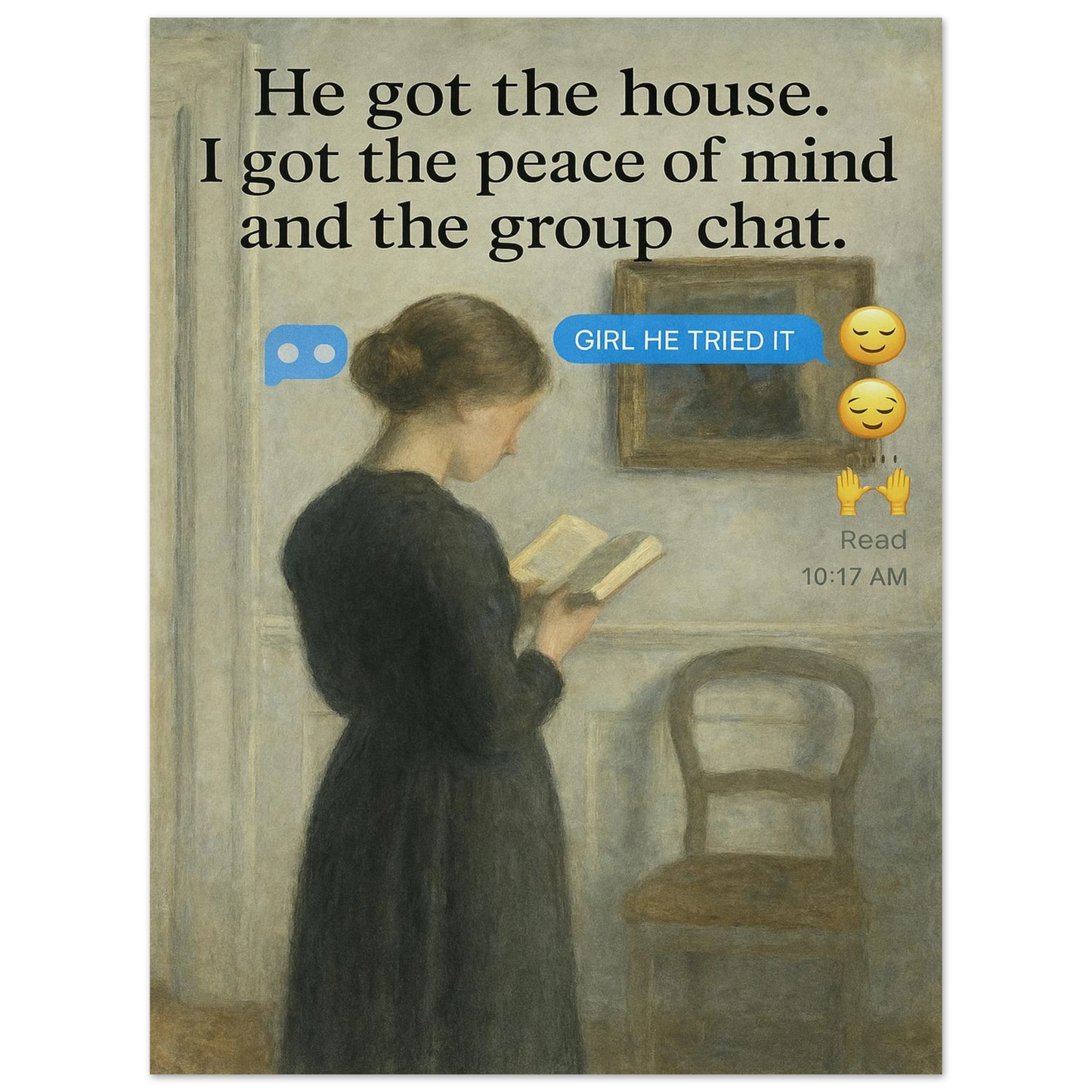 I Do, I Did, I’m Done is a witty and empowering art piece that blends classical elegance with modern breakup humor. Featuring a vintage-inspired painting overlaid with bold text-message commentary, this print celebrates moving on with peace, perspective, and the group chat receipts. Perfect for anyone who’s reclaimed their freedom and knows laughter is the best closure.