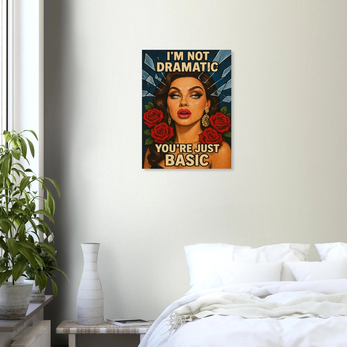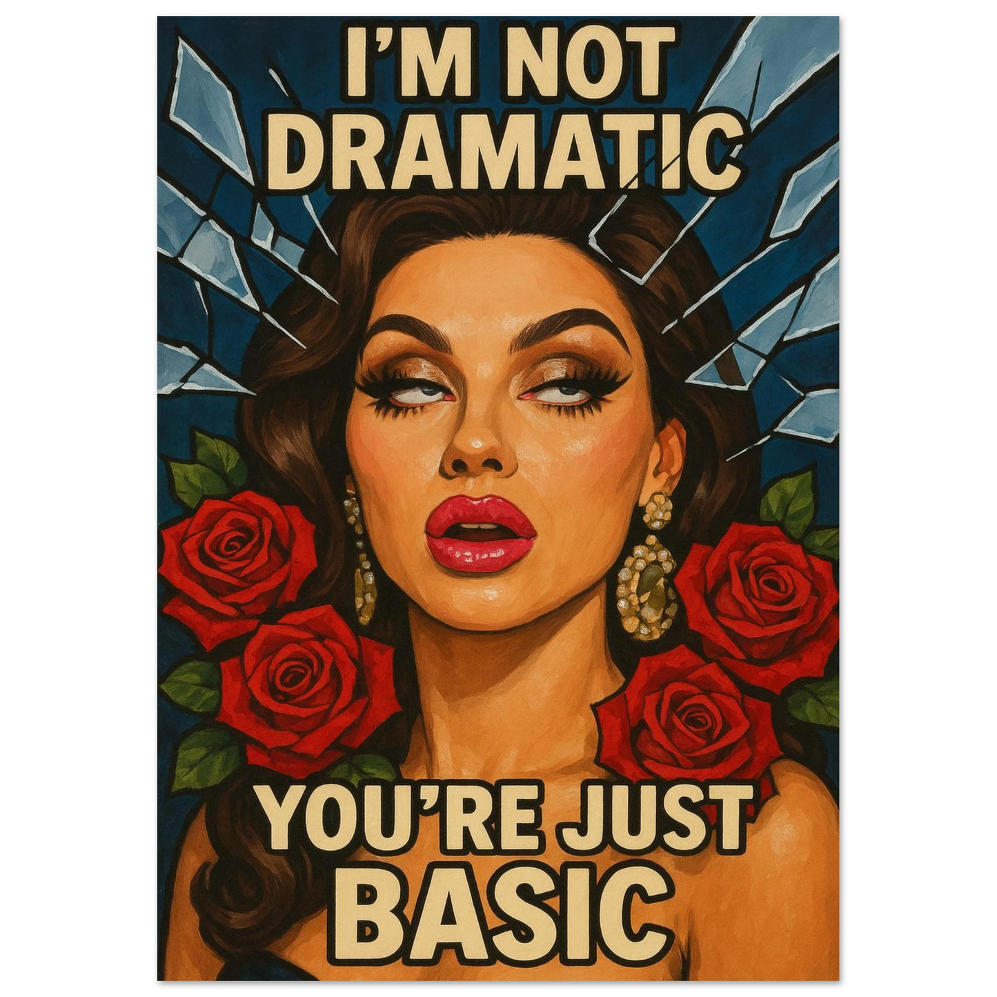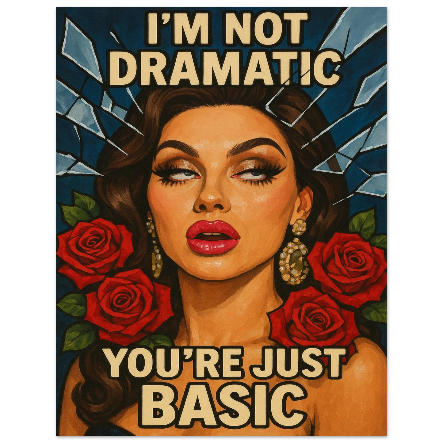 This pop-art glam piece is dripping with attitude and elegance. I’m Not Dramatic. You’re Just Basic. (Version 2) features a fierce, unapologetic beauty surrounded by roses and shattered glass, making it the ultimate power statement for anyone who embraces confidence over conformity. Perfect for bold interiors, beauty lovers, and collectors of art with a bite. 💋🌹⚡