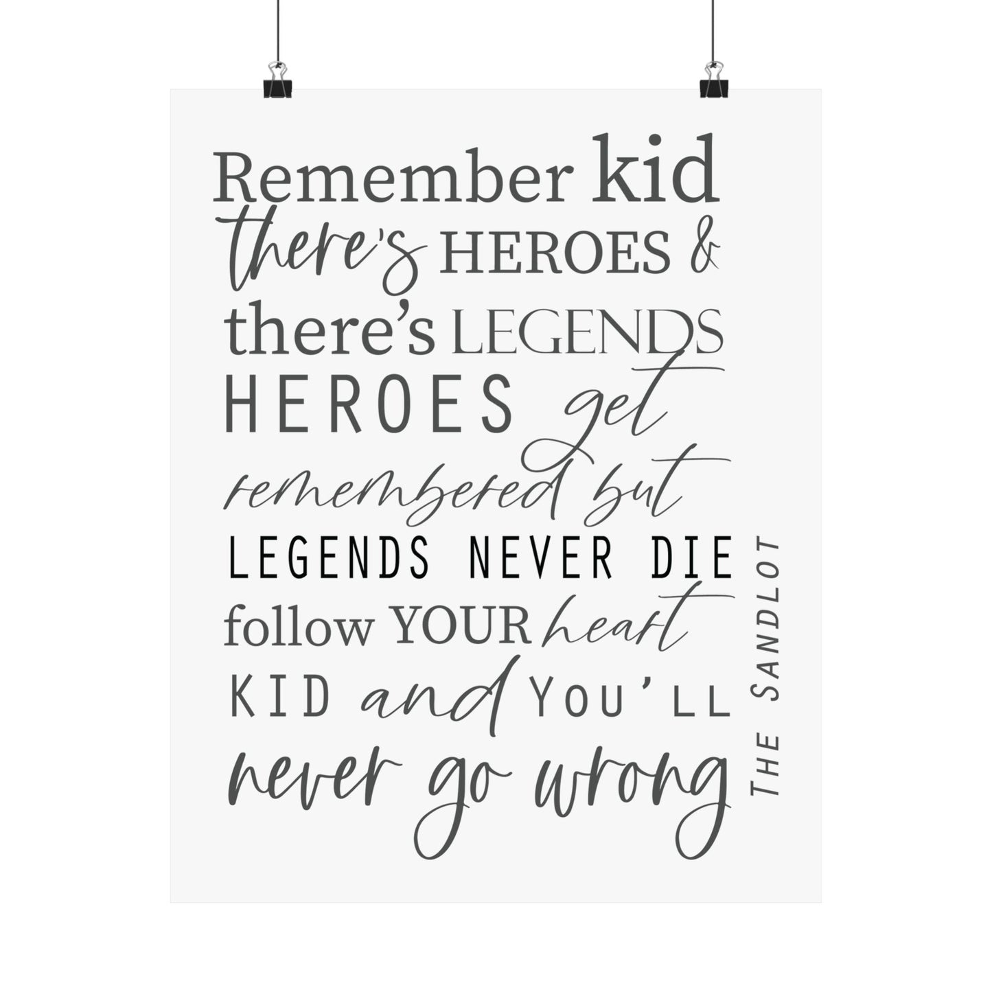 Keep the legend alive with our Legends Never Die poster featuring the iconic quote from The Sandlot. Show off your love for the movie with this must-have addition to any fan's collection. Perfect for adding a touch of nostalgia to any room. Don't let the legend fade away, get yours today!
